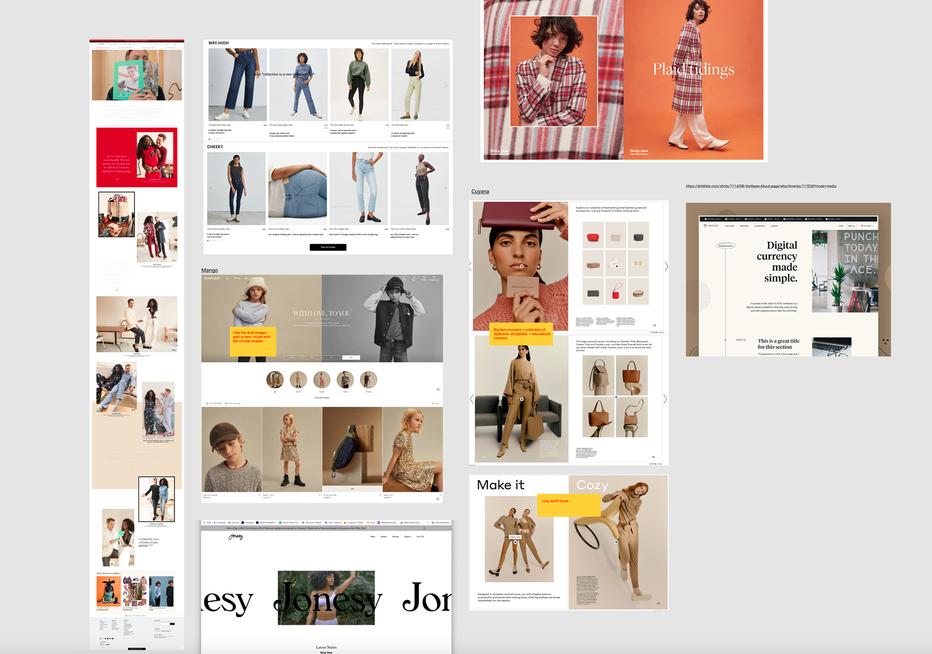 From early on, it was decided that the landing page would set the tone for the rest of the campaign as it was a high-visibility page. To get a feel of the competitive landscape, I pulled some swipe from our other brands in the retail space, and took a look at the way the story is told through the pairing of imagery, composition and typography.